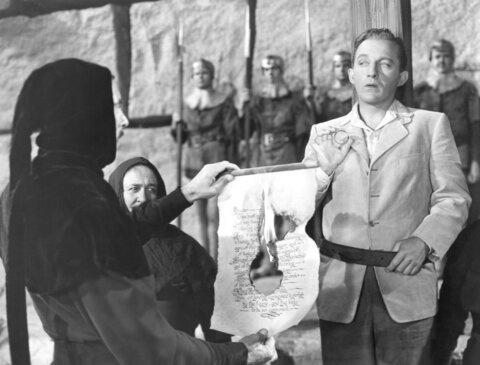 Unlike the Yankee played by Bing Crosby in this scene from The Connecticut Yankee in King Arthur's Court, Mark Twain's Yankee doesn't use a watch crystal as a magnifying glass to set fire to the proclamation ordering his execution; in fact Mark Twain's Yankee doesn't have a magnifying glass or even a watch and never sees a written proclamation.